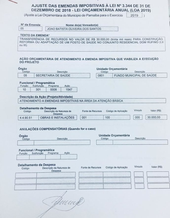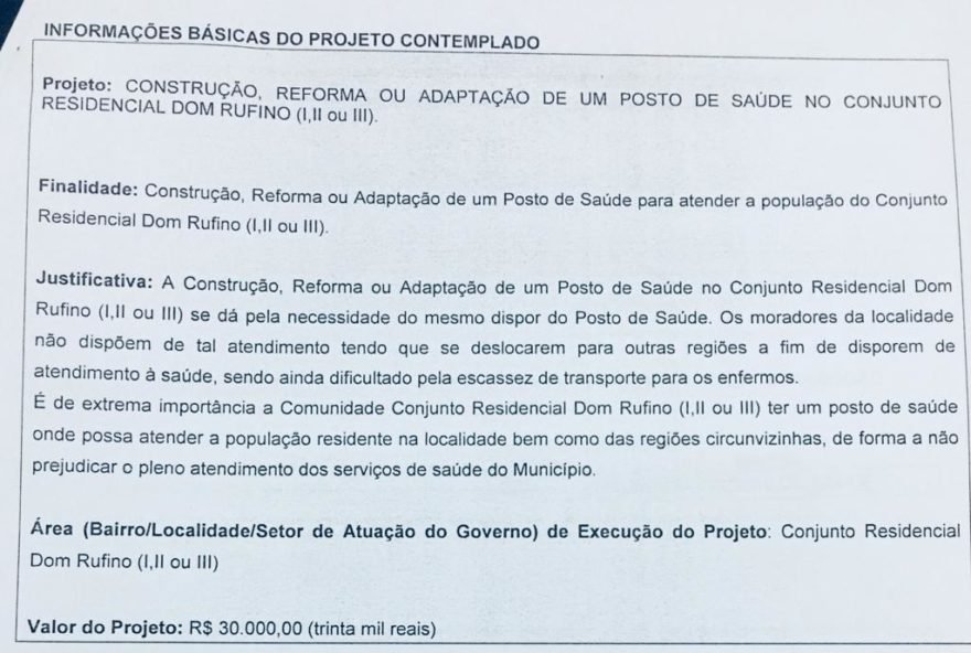 O valor destinado pelo vereador é de R$ 30.000,00 (trinta mil reais) e indicados para a construção, reforma ou adaptação de um POSTO DE SAÚDE para atender a população do CONJUNTO DOM RUFINO (I,II ou III).