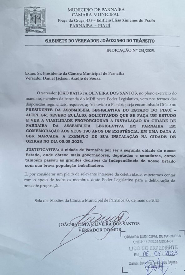 O vereador de Parnaíba Joãozinho do Trânsito (MDB), aprovou requerimento na Câmara Municipal solicitando o envio de ofício ao presidente da Assembleia Legislativa, deputado Severo Eulálio, a fim de que seja vista a possibilidade da instalação daquele Poder Legislativo na cidade de Parnaíba, a exemplo do que já ocorreu na cidade de Oeiras. A data, ainda a ser marcada, seria dentro da programação comemorativa dos 190 anos de emancipação pólitica do municipio, dia 14 de agosto.