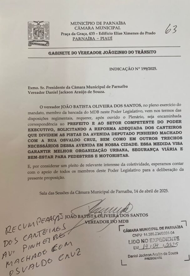 O vereador Joãozinho do Trânsito teve aprovada na Câmara Municipal a sua indicação onde solicita a recuperação e a reforma adequada dos canteiros que dividem as pistas da Avenida depútado Pinheiro Machado com a Rua Osvaldo Cruz, bem como em outros trechos onde igualmente necessitam de reparos.